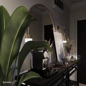 In this project I inserted a console where there is space to store shoes in the lower area, blankets and on top I decided to put a coffee machine, because I find it practical and also for those who come to visit.